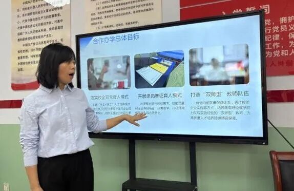 随后,新龙软件科技股份有限公司负责人作汇报,重点介绍了公司在合作办学体系建设、双师型师资队伍打造、人才培养模式创新、实习实训基地共建及访企拓岗推进等方面取得的成果,并明确了2026年度的合作目标。